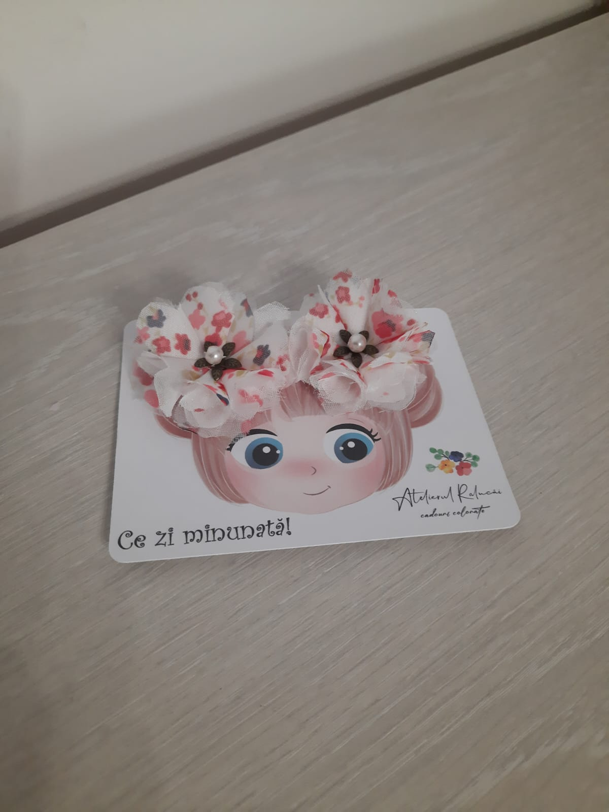 Setul format din doua clame crocodil, decorate cu rozete din panglica cu model. Rozetele au aproximativ 5 cm. Pregatite sa fie oferite caddou unei fetite cohete.