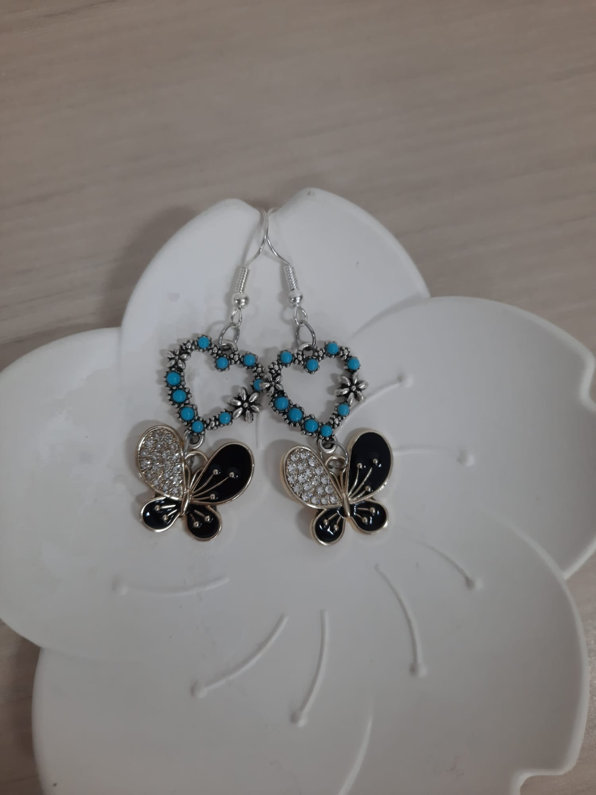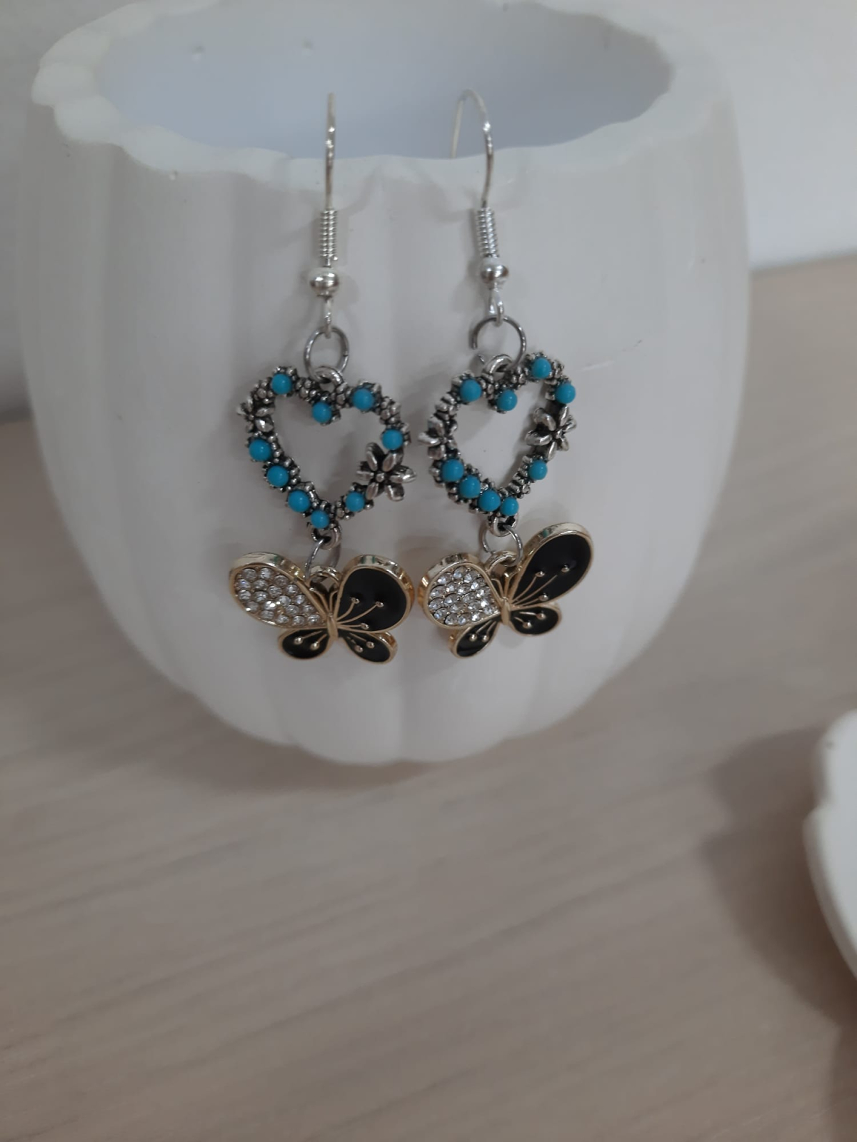 Cerceii sunt lungi, cu tortite si elemente metalice . Decorati cu inimioare si fluturi alb-negru. Sunt perfecti pentru o iesire la cafea dupa amiaza.