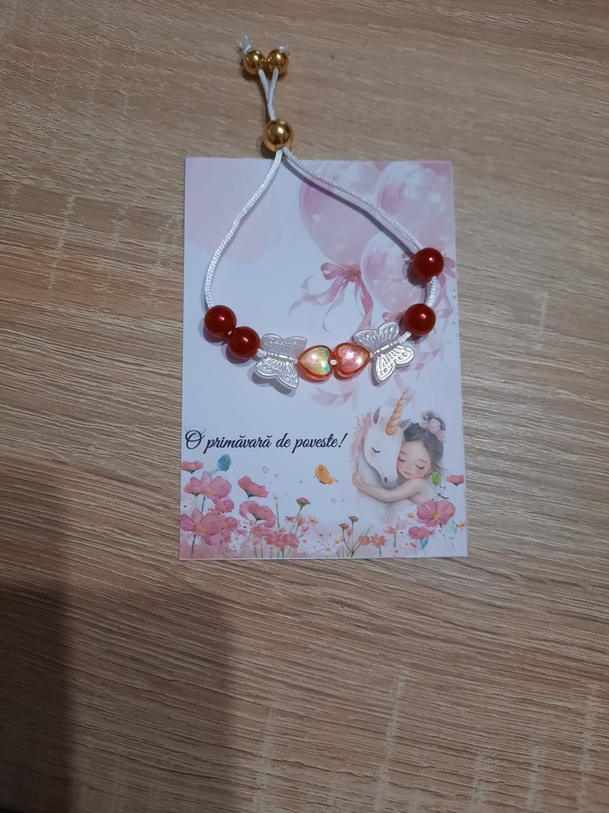 Bratara pentru fetite cu fluturasi si margele, reglabila. Este pe snur cu margele aurii in capete.