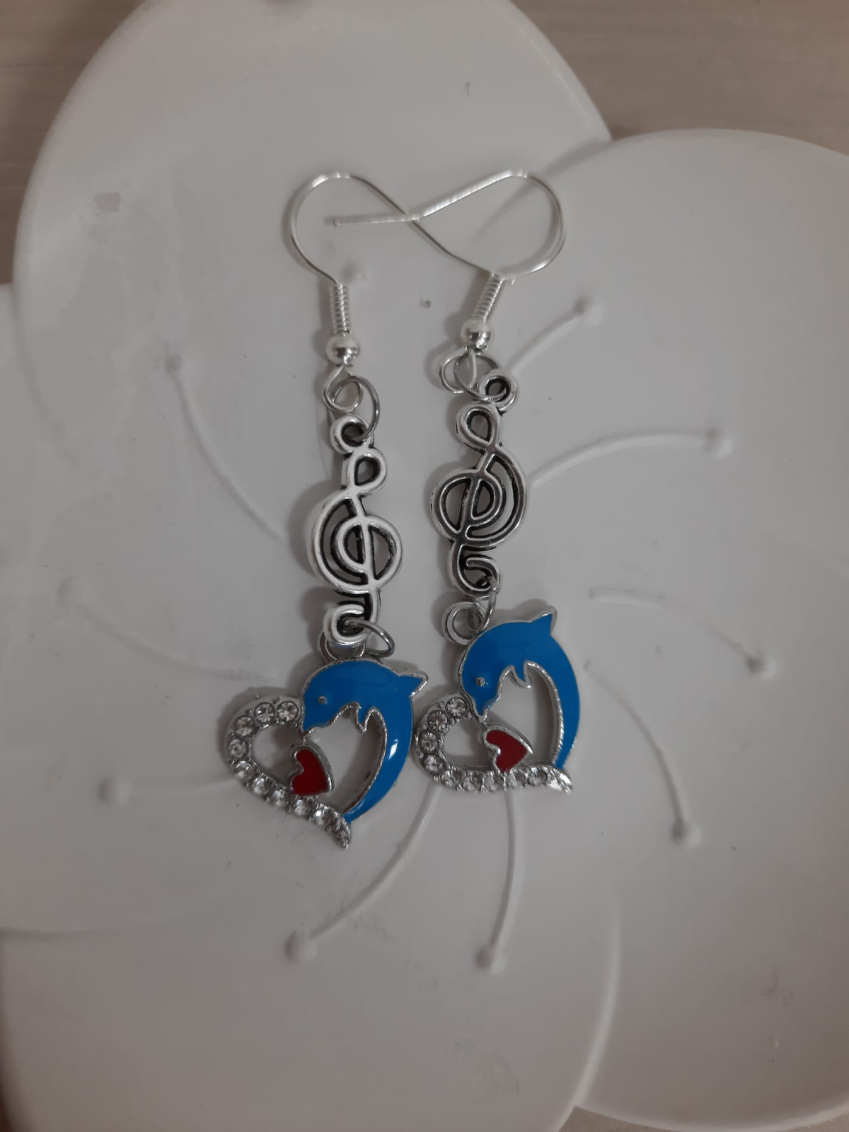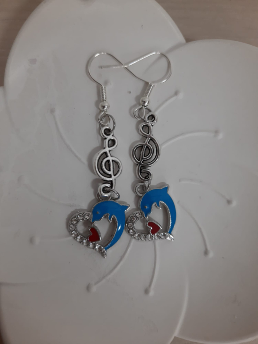 Cercei lungi cu cheia sol si delfini. Cerceii au tortite si elemente metalice decorative.