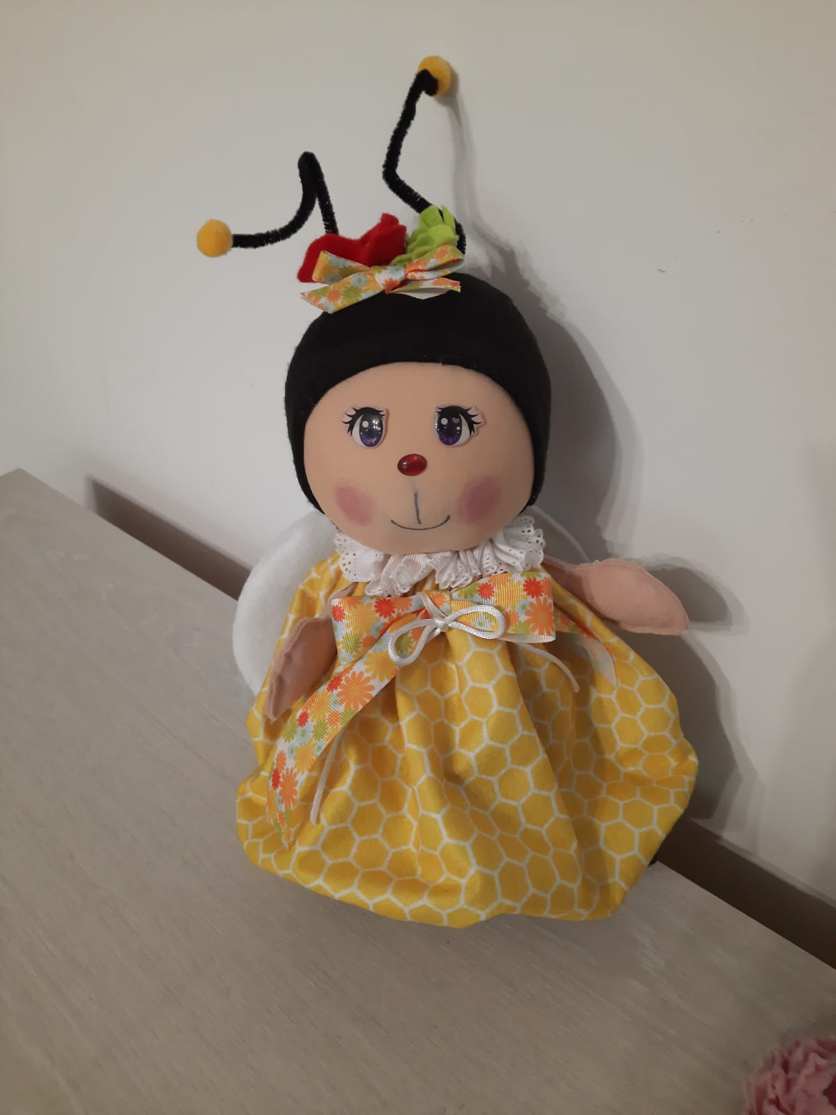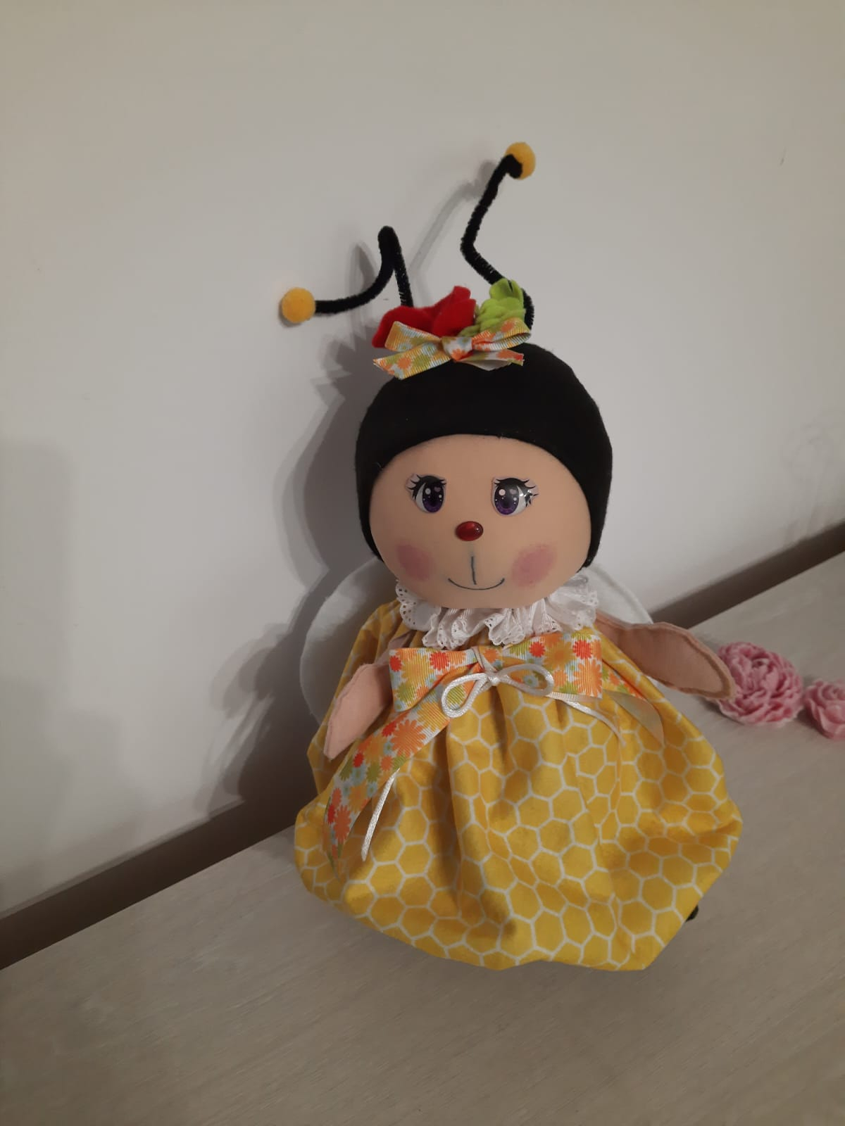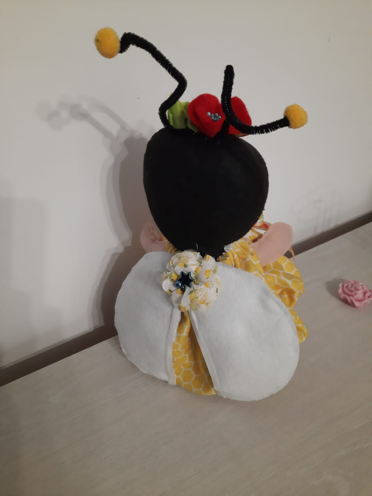 Albinuta este decorata cu funde si flori, are rochita cu faguri si antene. Este cuminte si ascultatoare si foarte harnica. Este cusuta mmanual din materiale textile si este ummmplluta cu vatelina hipoalergenica. Are aproximativ 23 cm inaltime.