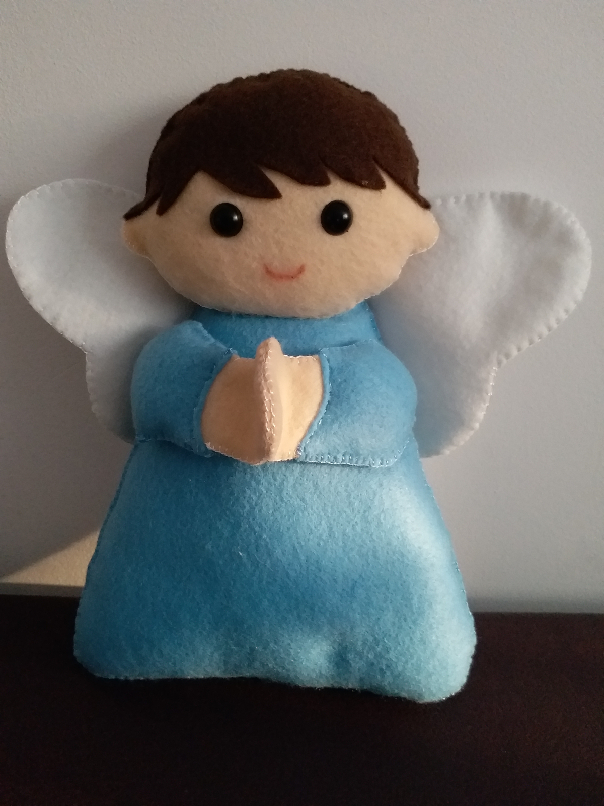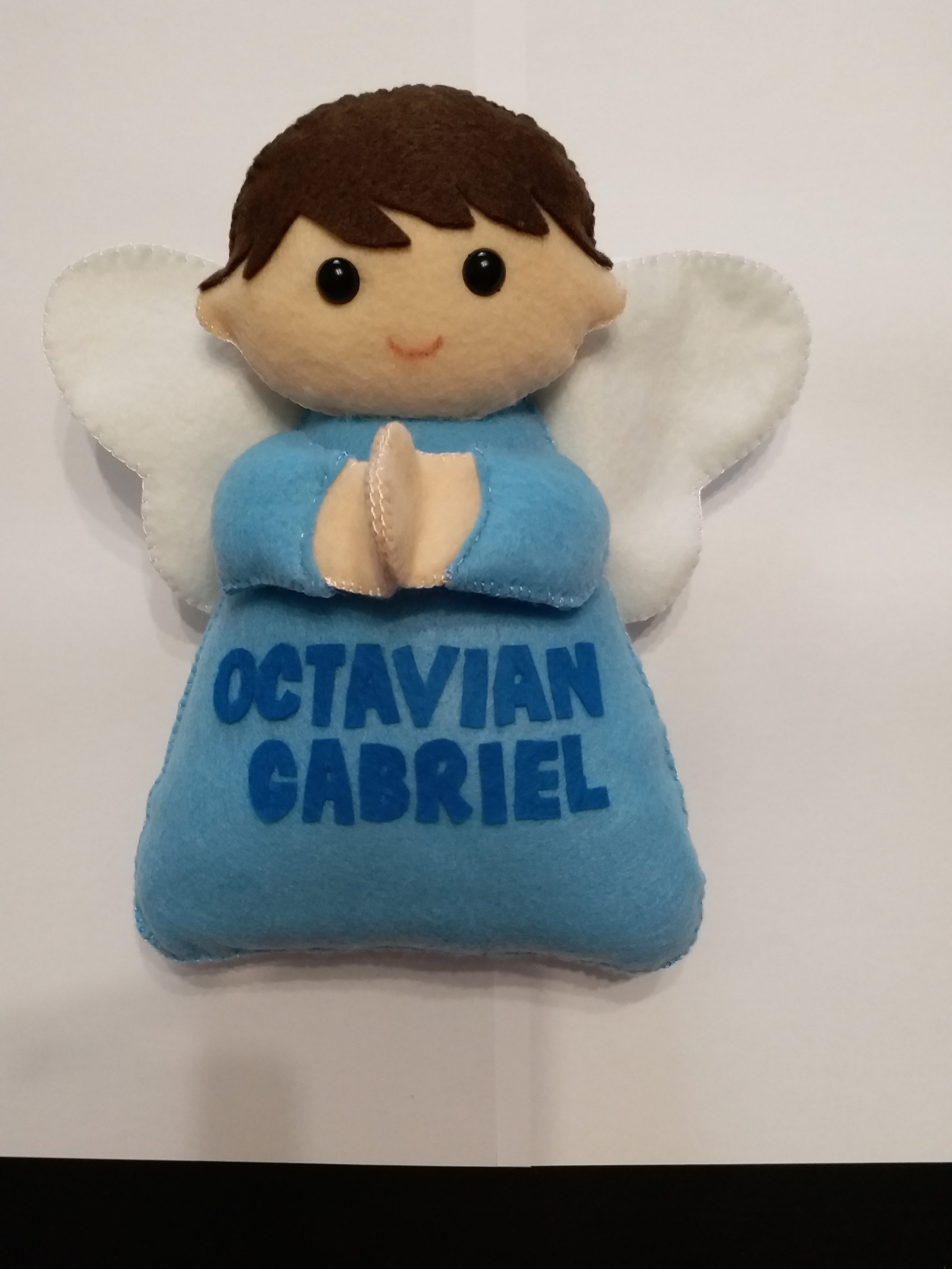 Decoratiunea baietel este cusuta manual din material textil moale umpluta cu vatelina hipoalergenica. Se poate personaliza cu numele copilului. Este decorativa si se poate oferi la nasterea copilului, la aniversarea de 1 an sau la orice alta sarbatoare. Are aproximativ 30 cm inaltime.