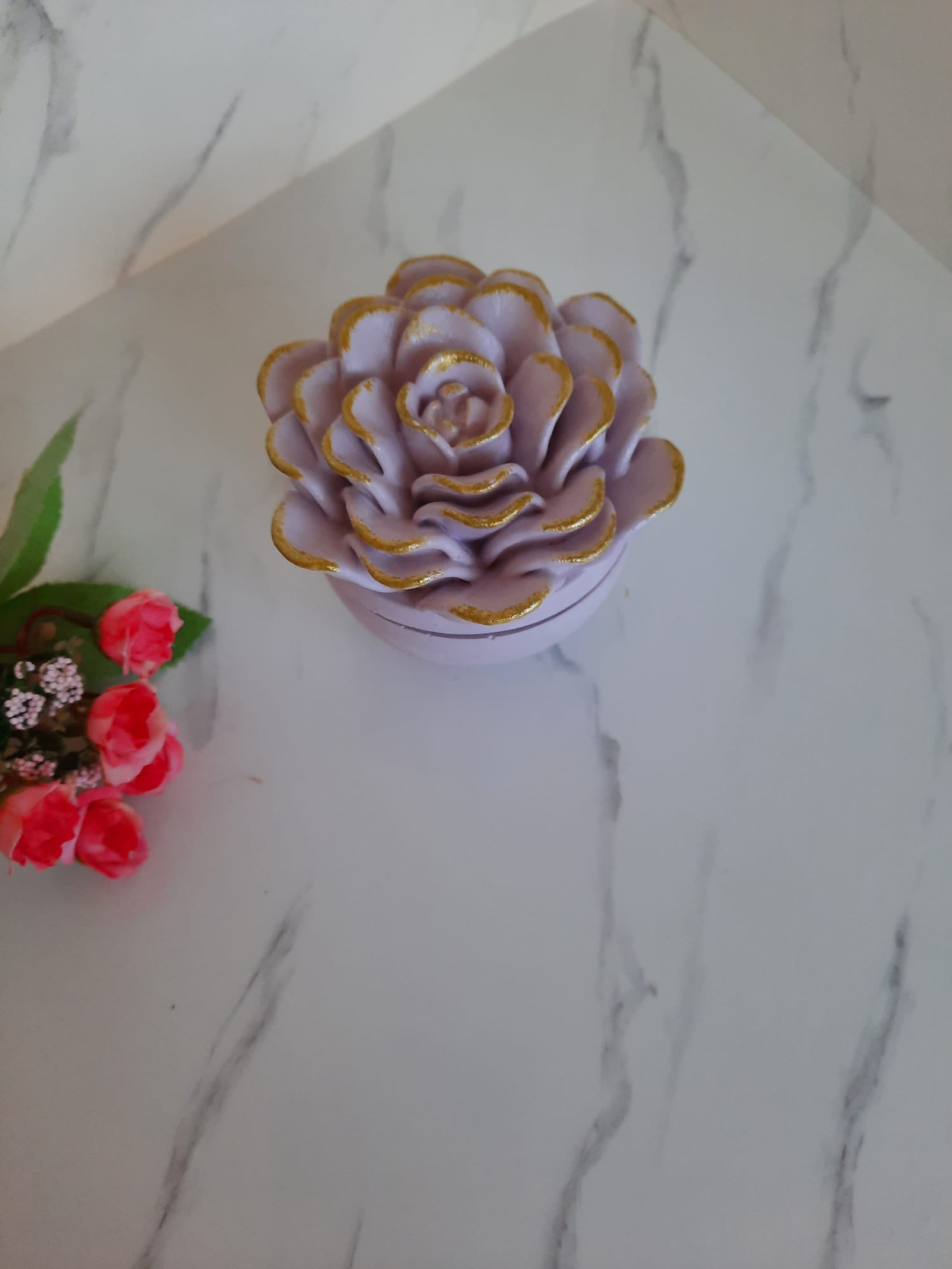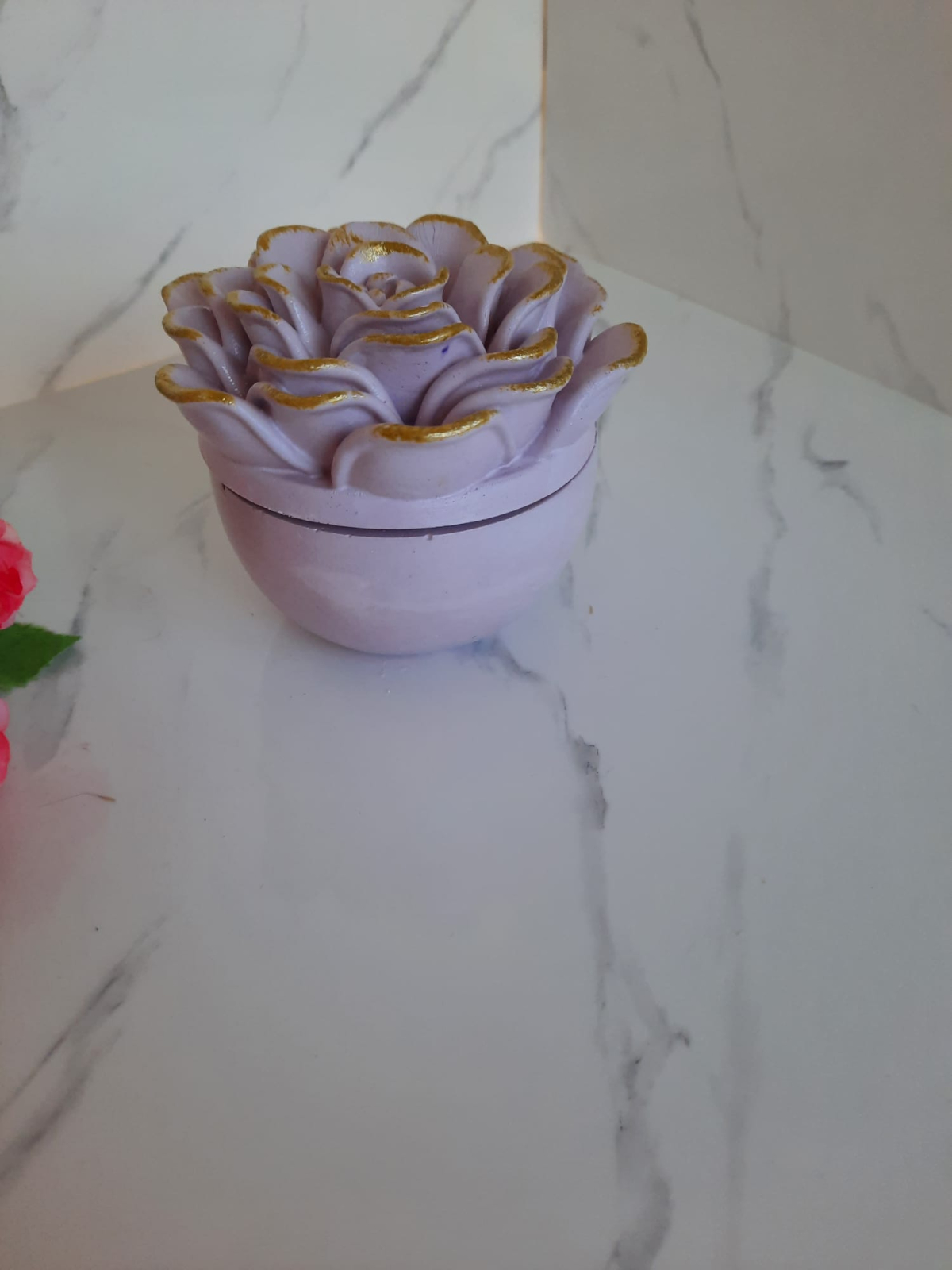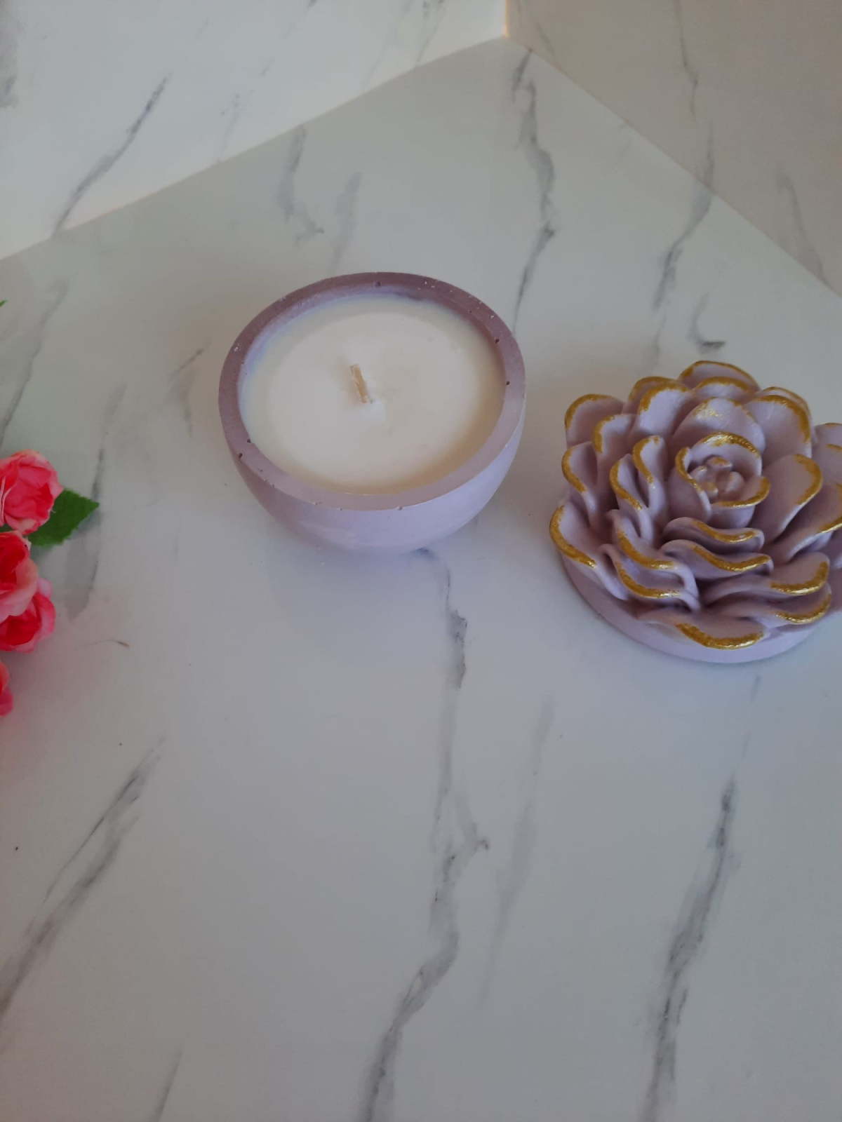 Lumanarea din ceara de soia, este turnata in recipient ceramic in forma de crizantema, pictat si lacuit. Este un cadou minunat pentru orice aniversare. Are 10-12 cm.