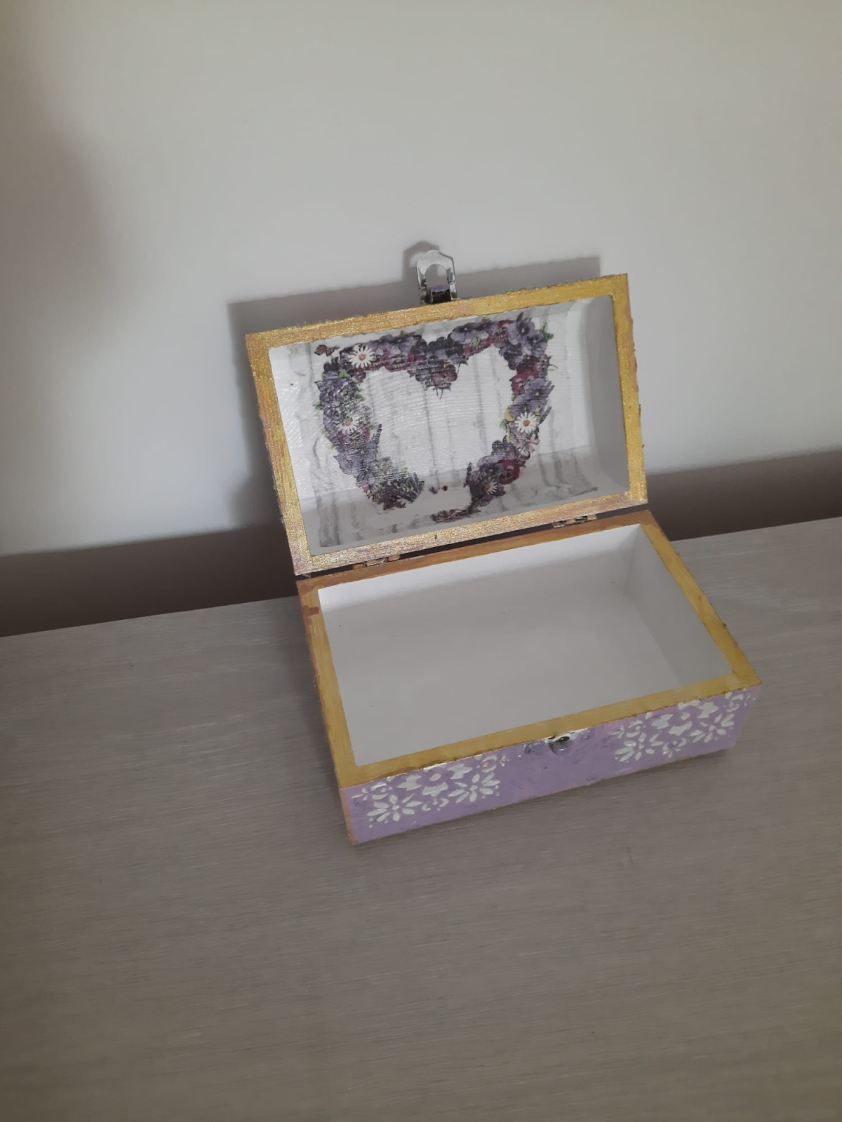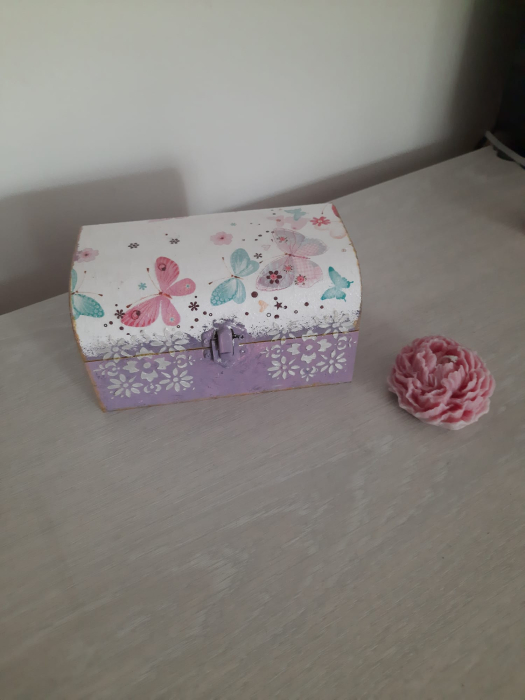 Caseta bijuterii din lemn, pictata si lacuita, decorata cu tehnica decoupage. Are aproxiativ 20 cm.