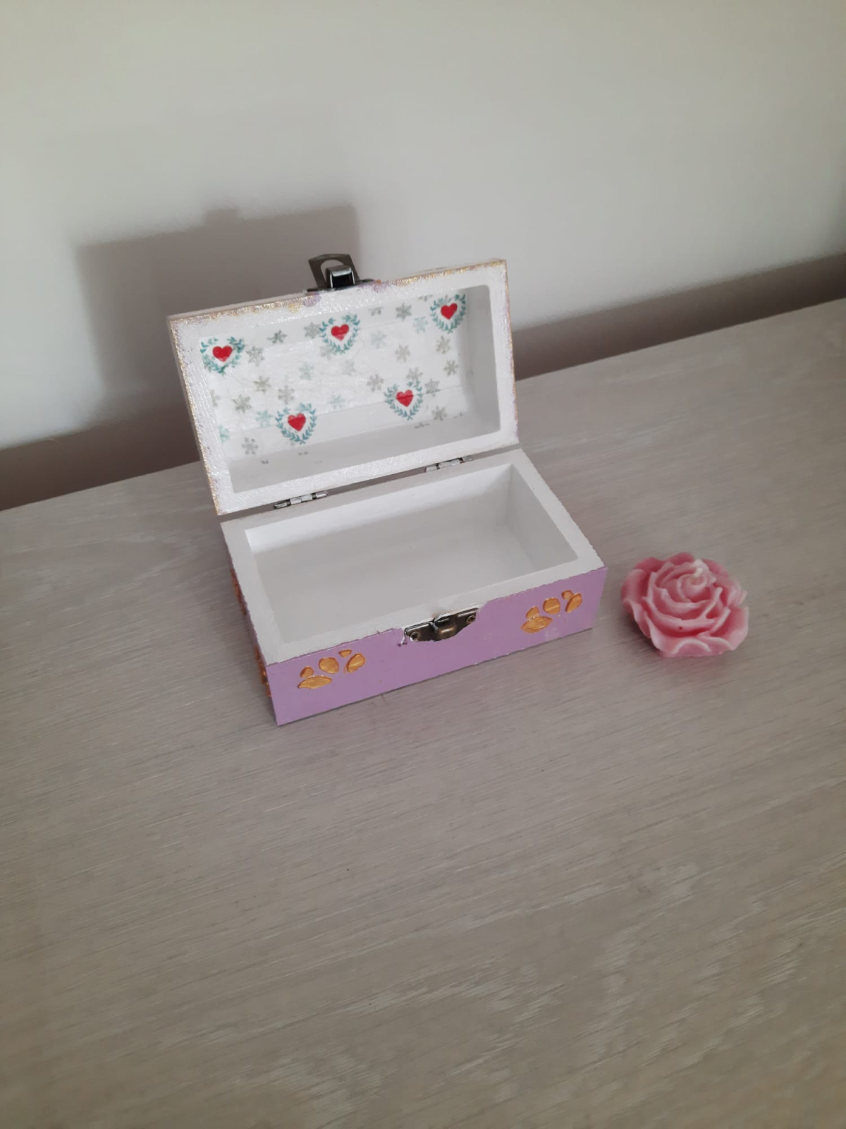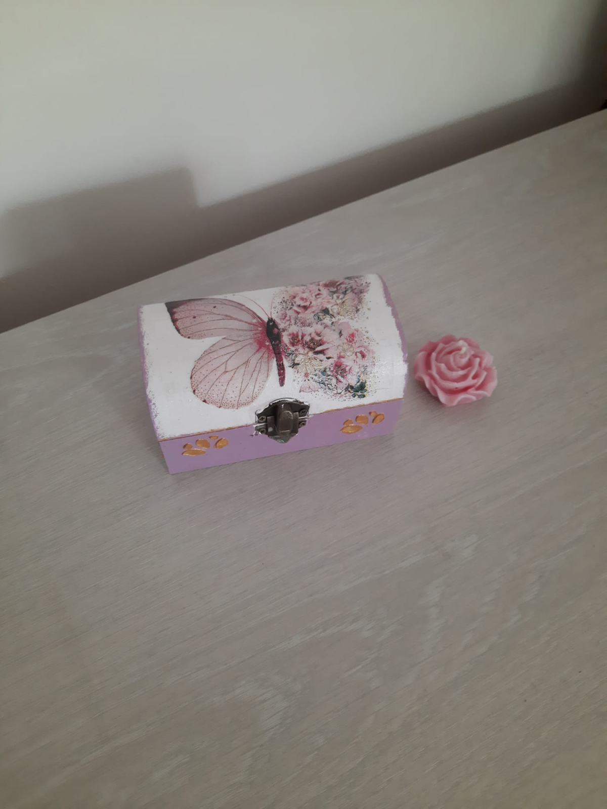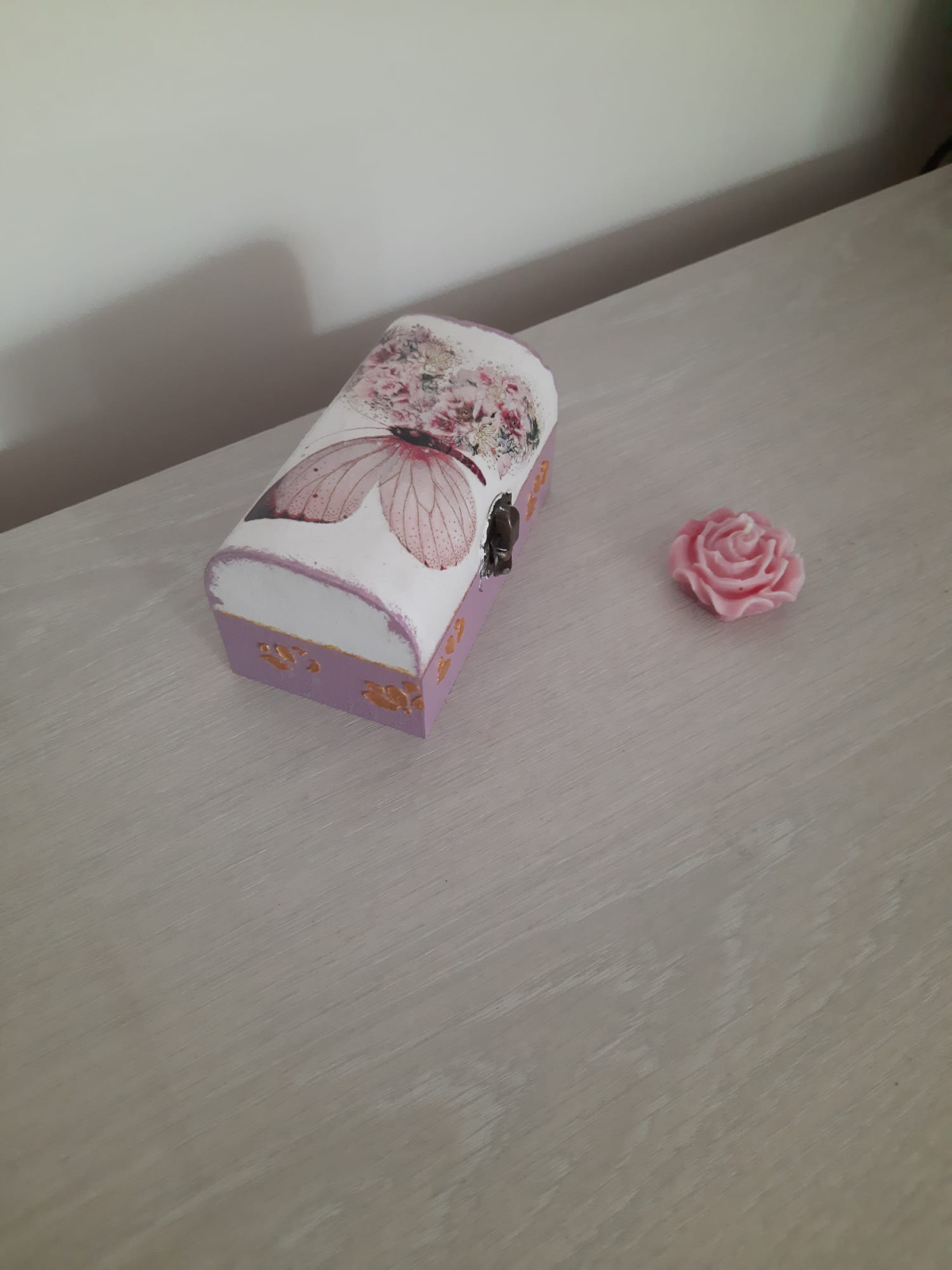 Caseta de bijuterii din lemn, decorata cu tehnica decoupage, pictata si lacuita. Are aproximativ 12 cm. Este pregatita sa primeasca bijuteriile unei micute domnisoare si sa le pastreze!
