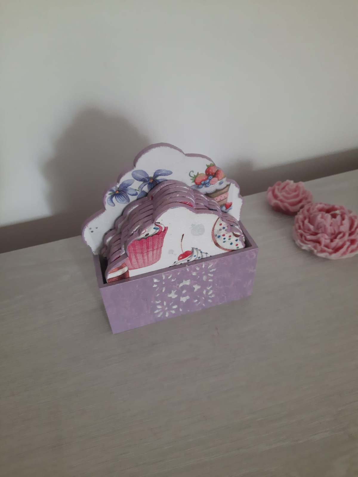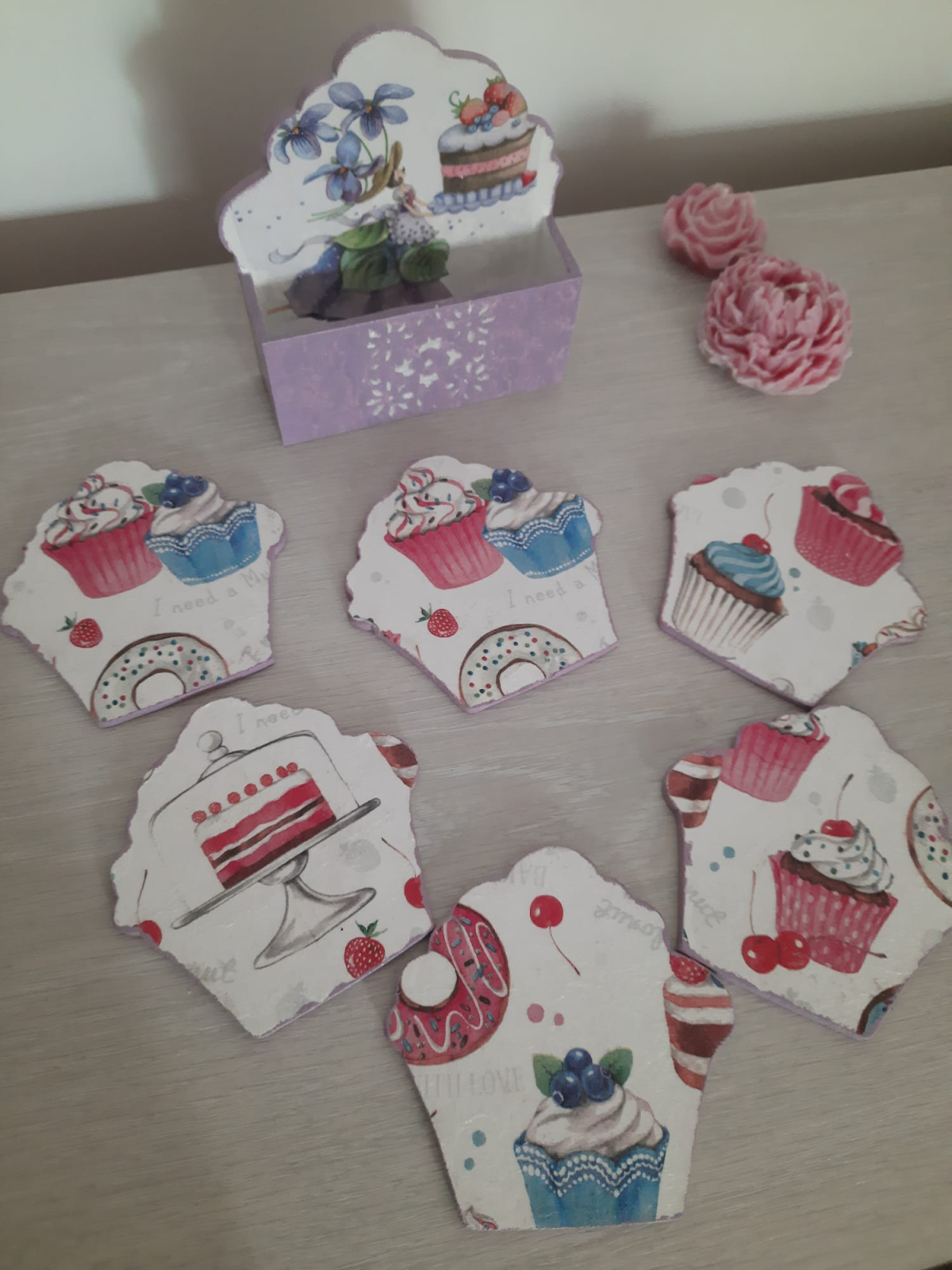 Suporturi de pahare in forma de briose, cu doua fete. Pe o fata au model cu capsuni, pe cealalta fata model cu prajituri. Setul este format din 6 suporturi si o caseta transport. Sunt din lemn, decorate cu tehnica decoupage, lacuite de doua ori. Au aproximativ 10 cm, iar caseta 13 cm.