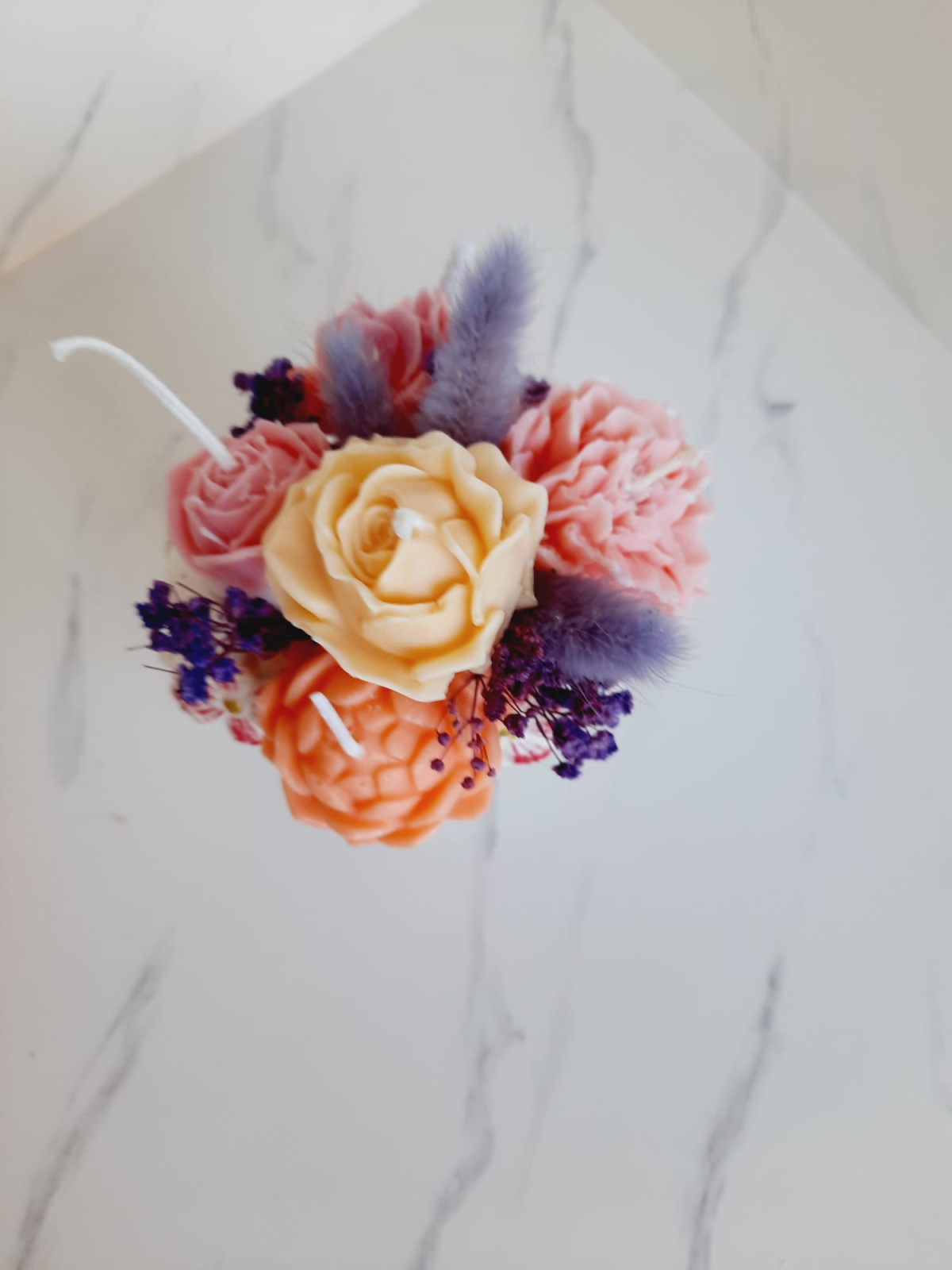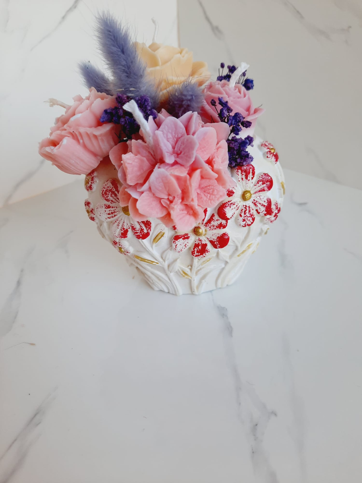 Minivaza este turnata din praf ceramic, este accesorizata cu flori parfumate in ceara de soia si fllori uscate. Se poate pastra timp indelungat ca decor, parfumand camera in acest timp. Sau se pot arde florile, dar nu in vaza ci pe o farfurioara separata sau intr-un difuzor. Are aproximativ 13-15 cm inaltime.